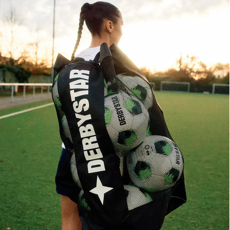 10 Stck. Derbystar Junior s light Kinderfußälle im Ballpaket mit Ballsack Das 10er‑Ballpaket Derbystar Junior s‑light mit praktischem Ballsack ist die ideale Komplettlösung für Schulen, Vereine, Fußball‑AGs und Kindergruppen. Die leichten PU‑Bälle bieten ein besonders weiches Ballgefühl und sind perfekt für junge Spieler, die ihre Technik verbessern und spielerisch trainieren möchten. Der mitgelieferte Ballsack bietet Platz für alle 10 Bälle und erleichtert den Transport zum Training oder Sportunterricht. Dank der luftdurchlässigen Mesh‑Konstruktion trocknen die Bälle nach dem Spielen schneller und bleiben länger in gutem Zustand. Junior s light Kinderfußälle aus PU Material sind garantiert PVC frei Jeder Ball wiegt ca. 290 g und bleibt durch das PU‑Material auch bei niedrigen Temperaturen weich. Die maschinengenähte Verarbeitung und die stabile SR‑Blase sorgen für ein gleichmäßiges Sprungverhalten und zuverlässige Luftstabilität. Ein rundum praktisches Set für Gruppen, die Wert auf Qualität, Ordnung und einfache Handhabung legen. PU Bälle bleiben auch im Winter bei Schnee und Kälte weich und geschmeidig und ein angenehm zu spielende Kinderfußbälle. Derbystar Junior s light empfohlen als Freizeitball 10× Derbystar Junior s‑light Kinderfußball inkl. Ballsack für Transport & Aufbewahrung reduziertes Gewicht (ca. 290 g) – ideal für Kinder PU‑Material, glänzend und weich besonders angenehmes Ballgefühl maschinengenäht stabile SR‑Blase Größen 3, 4 oder 5 bleibt auch bei Kälte weich ideal für Schulen, Jugendmannschaften & Einsteiger Beim Junior s-light Ball handelt es sich um einen Freizeitball. Für den professionellen Trainingsbetrieb schlagen wir Ihnen andere Modelle vor. In diesem Fußball Ballpaket enthalten: 10 Stck. Derbystar Junior s light Kinderfußbälle, Stückpreis UVP: 19,99€ inkl. MwSt. +1 Derbystar Ballsack für 10 Fußbälle, Preis in diesem Ballpaket UVP: 29,99€ inkl. MwSt. Beschreibung BallsackIn diesem Derbystar Ballpaket ist ein Ballsack für 10 Fußbälle enthalten.Material Ballsack: PolyesterSeitliche Entlüftungsnetze: PolyesterDurchmesser: ca. 43 cm, Höhe: ca. 75 cm. Häufige Fragen zu Derbystar Junior s-light Ballpaket Was ist im Set enthalten? 10 Derbystar Junior s‑light Kinderfußbälle und ein Ballsack für Transport und Aufbewahrung. Für welche Altersklassen eignet sich das Set? Für F‑ und E‑Jugend sowie alle Kinder, die mit einem leichteren Ball spielen sollen. Warum ist ein leichter Ball sinnvoll? Das geringere Gewicht erleichtert die Ballkontrolle und unterstützt eine saubere Technikentwicklung. Bleiben die Bälle bei Kälte weich? Ja, das PU‑Material bleibt auch bei niedrigen Temperaturen geschmeidig. Sind alle 10 Bälle identisch? Ja, alle Bälle im Set sind Derbystar Junior s‑light in der gewählten Größe.